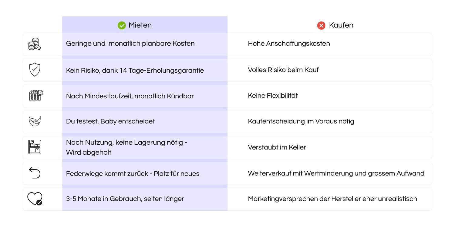 Wenn du eine Federwiege mietest, kannst du sie im echten Alltag ausprobieren, ohne dich langfristig festzulegen oder finanziell unter Druck zu setzen.